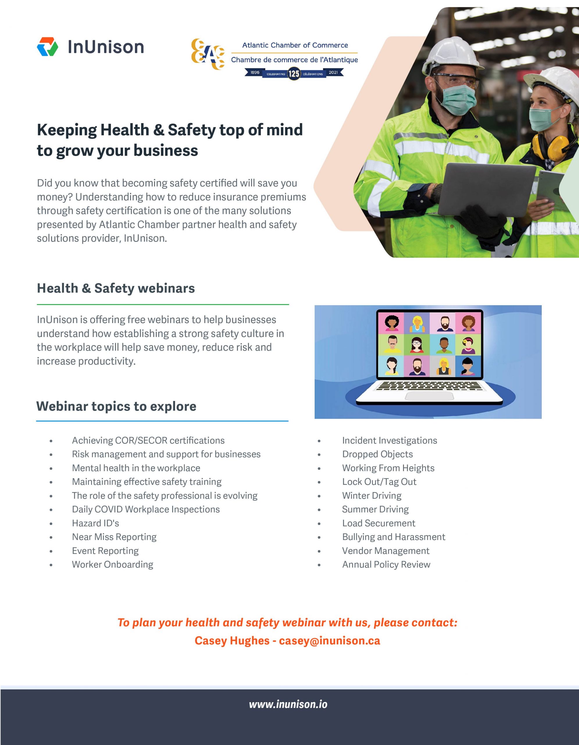 A series of live health and safety webinars were crafted for a newly established affiliate partnership with the Atlantic Chamber of Commerce, and their 94 chamber of commerce members, who represent business communities across Atlantic Canada. The webinars were crafted to introduce their membership to the InUnison brand, establish thought leadership in health and safety and create a two way dialogue. The webinar series connected InUnison to new markets in eastern Canada, and drove new SaaS product sign ups and safety consultations.