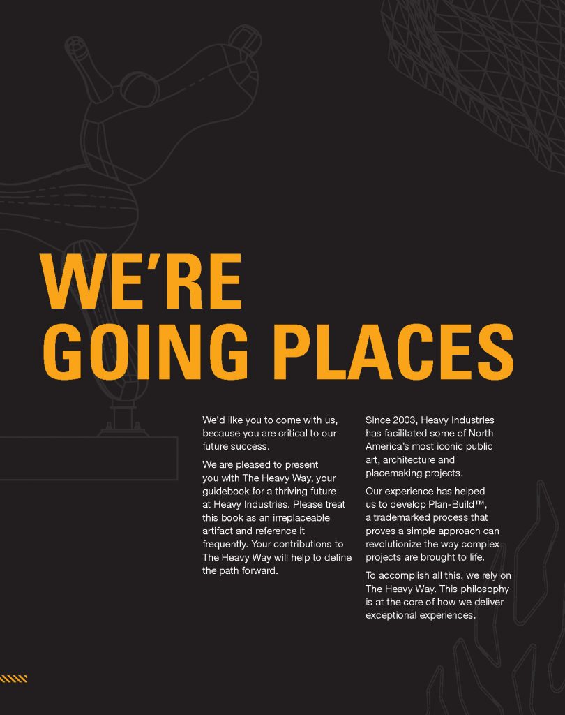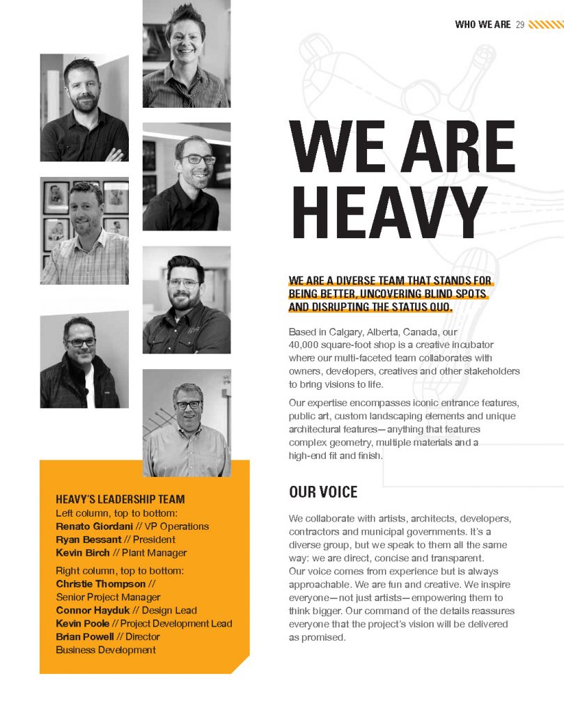 Calgary’s Heavy Industries is a company that builds iconic art and architecture and is the genius behind many of Calgary’s most recognizable works of public art that can be seen throughout the city. Over the past decade they’ve worked very hard for their clients, providing them with immersive placemaking elements and grandiose art in their communities. In doing so however, many of the core principles that make up their mission, vision and values became faded, outdated and misaligned.