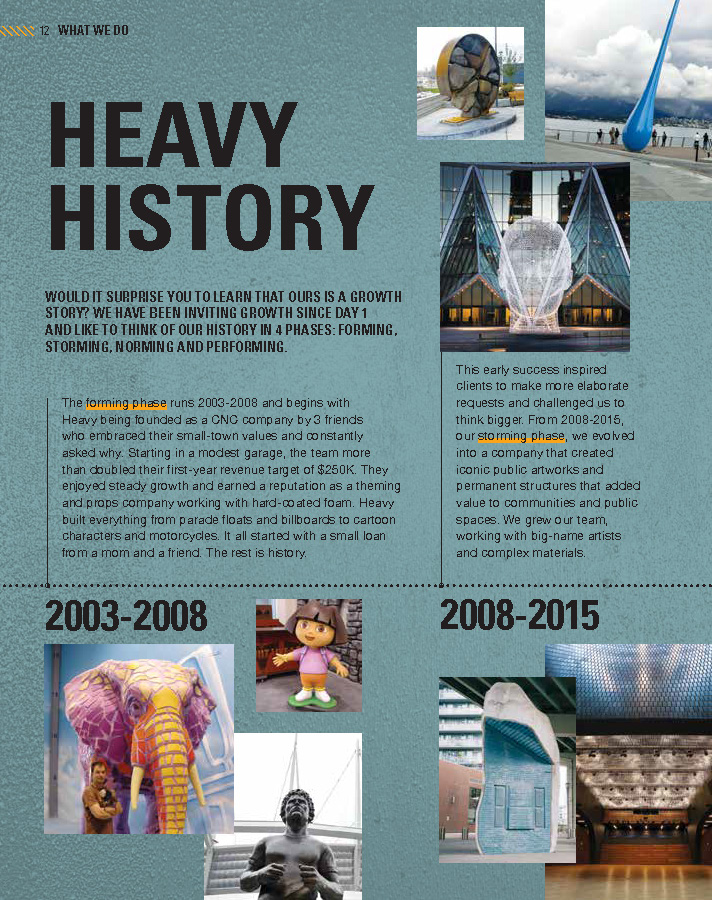 As the head of Heavy’s marketing team I lead the initiative to reinvent the voice of Heavy and develop a new set of core values to serve as a roadmap to guide the brand into the future. This involved months of face to face dialogue and hands-on engagement with all staff members, from the shop hands, to the CEO and partners. Everyone had a voice. Using the resulting data I built out a messaging framework and hierarchy that serves as the roadmap for all communications. I brought on a creative team to design and print a 60-page corporate guide book, refresh the website and coach staff. With a newly aligned messaging framework and the tools required to communicate it, the team is able to clearly and confidently represent Heavy and their core values.